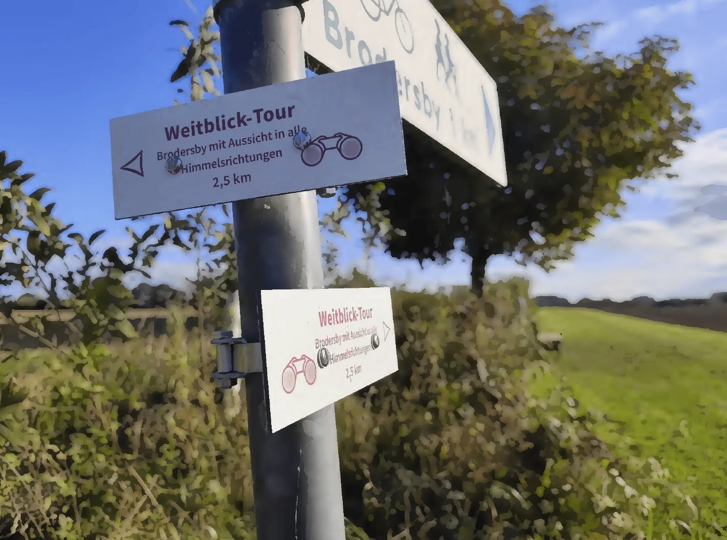 Auch die Gemeinde Brodersby möchte durch die Beschilderung von 7 neuen Rundwanderwegen, 3 Wegweisern pro Route, 3 Infotafeln mit insgesamt 110 Wegweisern ein hochwertiges und nachhaltiges Angebot für Touristen und Einheimische bereitstellen. An zwei Wanderwegen werden zusätzlich Infopulte aufgestellt, die Radfahrer und Wanderer über die Geografie und Geschichte der Gemeinde informieren.