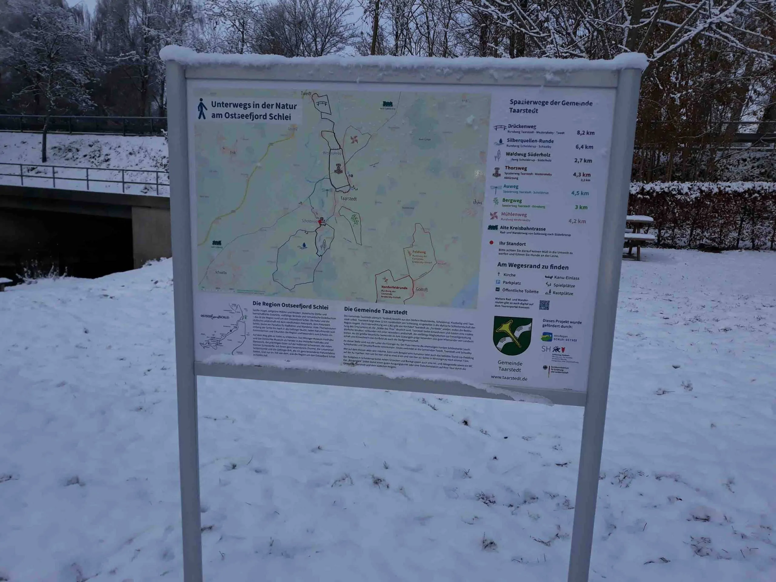 Auf zwei Informationstafeln wird eine Übersicht des Wanderwegnetzes der Gemeinde dargestellt. Diese sollen an den zentralen Punkten an der Alten Schule sowie am Bürgerpark aufgestellt werden. Die beiden Standorte dienen jeweils als Start- sowie Endpunkt für die verschiedenen Wanderrouten. Daneben werden noch drei Informationstafeln an den Kreuzungen angebracht, an der verschiedene Wanderwege aufeinandertreffen. Diese bieten einerseits eine Orientierungshilfe, vermitteln Eckdaten über die Gemeinde und werden im einheitlichen Basisdesign in Anlehnung an das Pilotprojekt Brodersby-Goltoft umgesetzt.