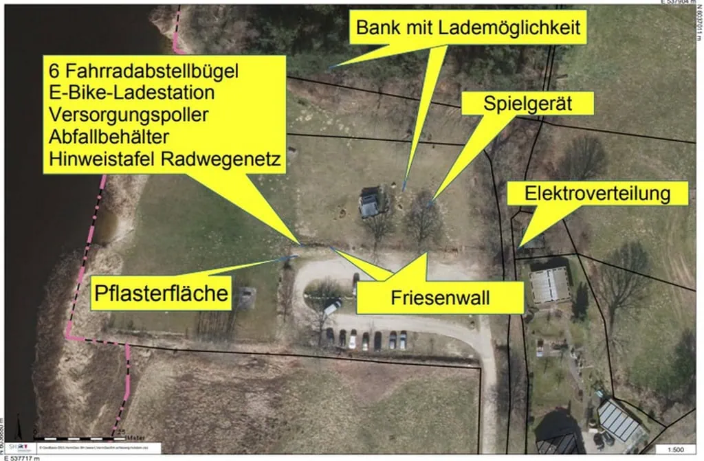 - Gestaltung von Grünflächen: Anlage eines Friesenwalls in Kombination mit Blühstreifen und naturnaher Begrünung zur Förderung der Biodiversität und Aufwertung des Landschaftsbildes.